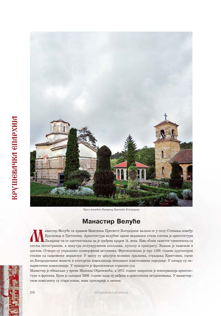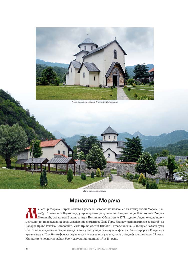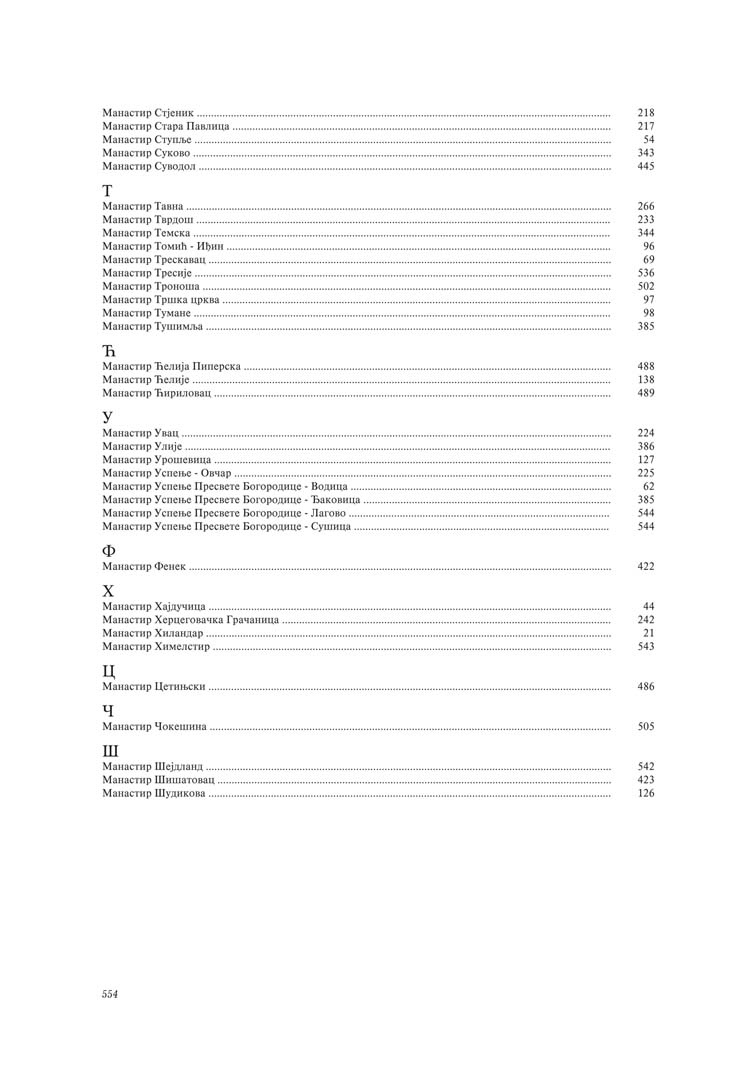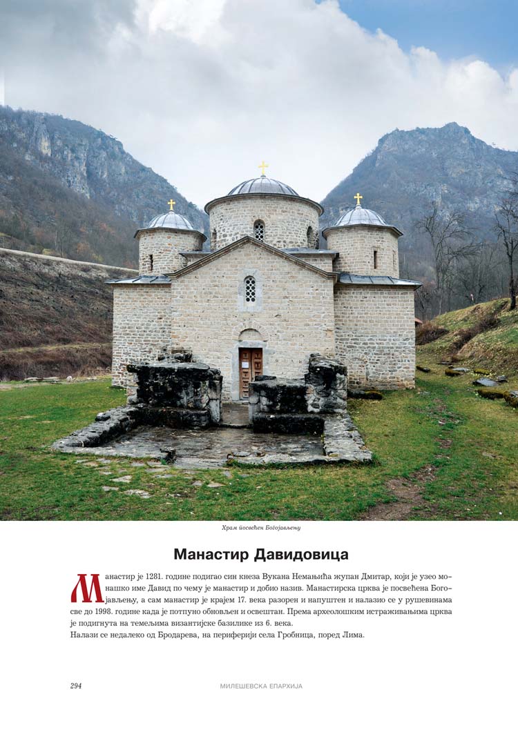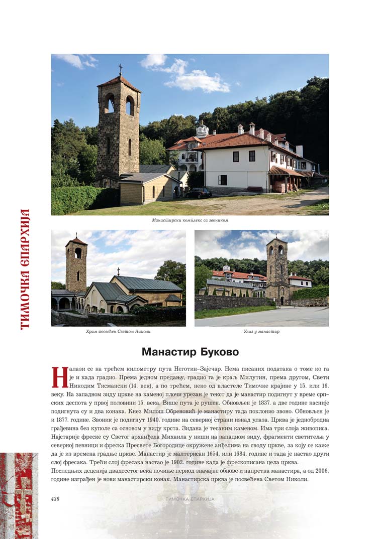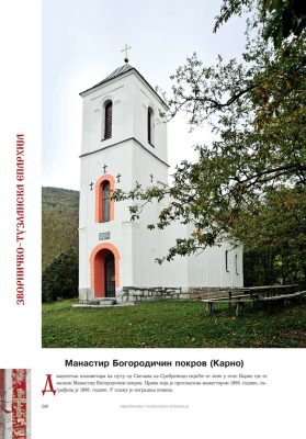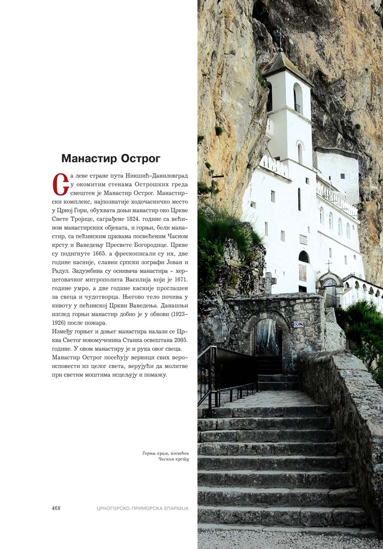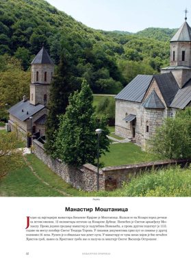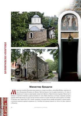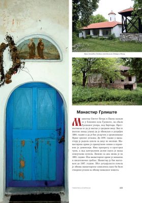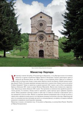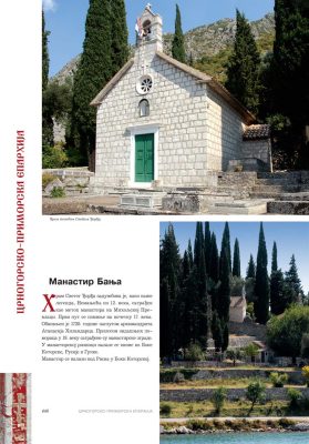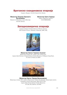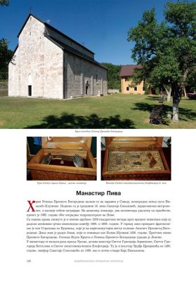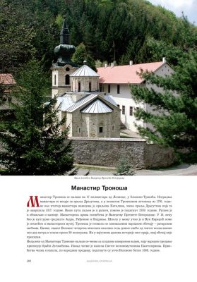 Све то прате фотографије као визуелна представа, а систматизоване у једном документу и као сведок једног времена. Манастири су представљени азбучним редом по епархијама.