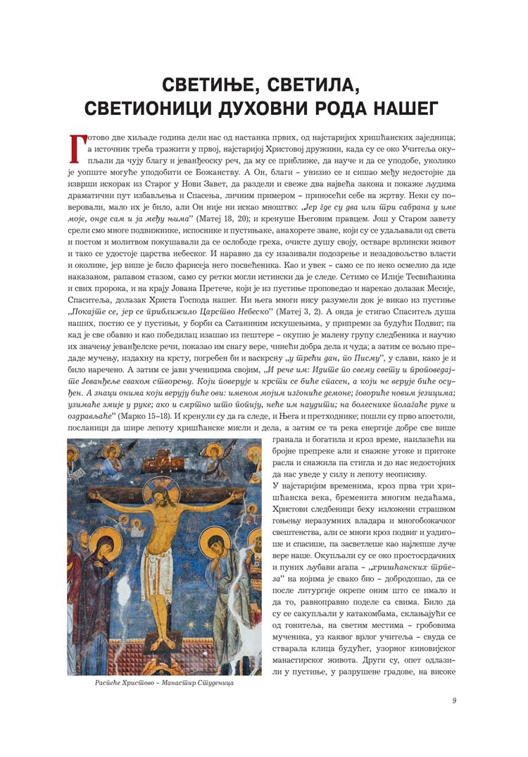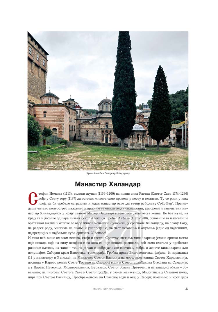 Познато је, мада звучи и невероватно да се, у Метохији рецимо,  налази највећа концентрација православних светилишта на планети (по квадратном километру терена); нажалост, данас је веђина тих светиња уништена, чак су и многи топоними манастиришта сасвим избледели из меморије веома често уништаваног и расељаваног српског живља. Будући читалац или корисник овог дела убрзо ће схватити да овај преглед српских светиња сведочи о неколико битних чињеница: да  готово сви манастири припадају категорији мученика, односно да су по више пута пљачкани, паљени и разарани; да су на њима вршене обнове чим би се времена примирила; да од 1985. године (до данас) присуствујемо фантастичној обнови (и градњи) православних светилишта на свим територијама где Срби живе.