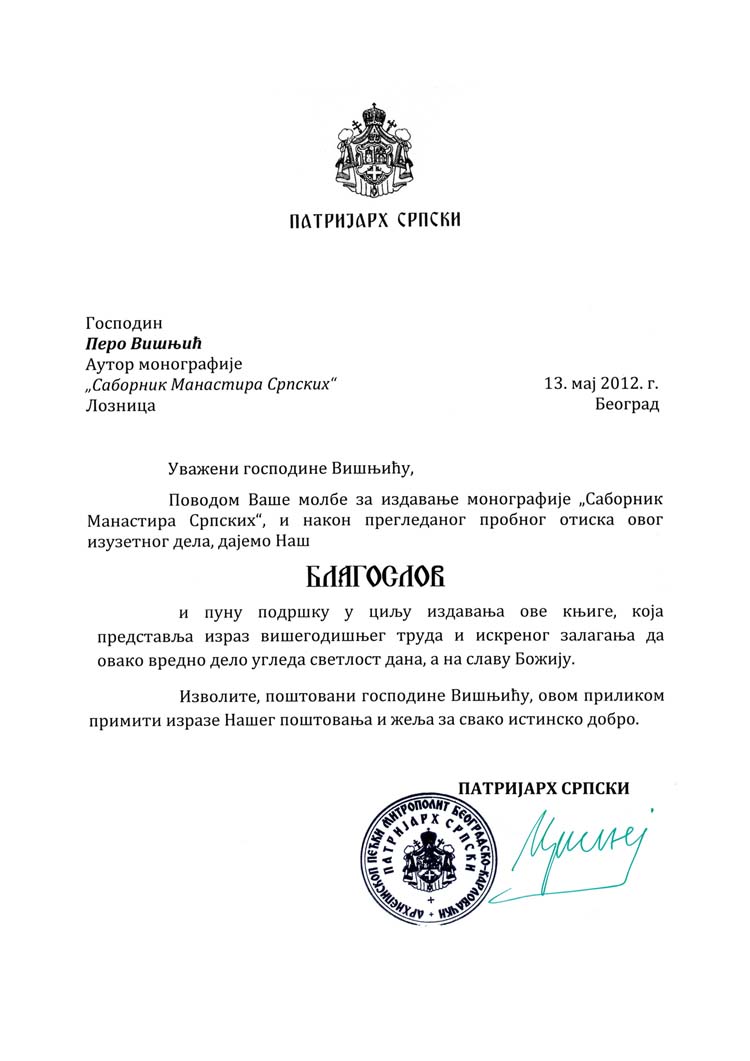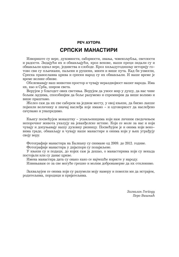 Благодарни смо господину Пери Вишњићу искрено – што треба да означи у складном споју срца и ума – на његовој изузетној књизи која би требало да се нађе у свакој кући српских људи, да би их она подстакла да посећују бисере српске културе – а култура је и религија и философија и уметност – православне манастире у Србији.